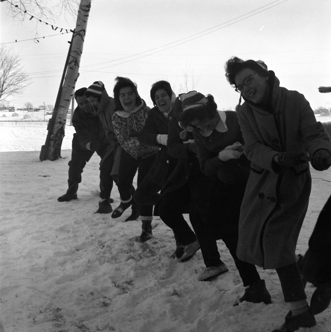 The 1963 Winter Carnival also featured a “Co-ed Tug of War”. Whether the male “anchor” at the back was invited or self-appointed is not known. G. Harris SDU Photographic Collection (UPEI Archives Acc #: 2013-250), Image 03-7589.