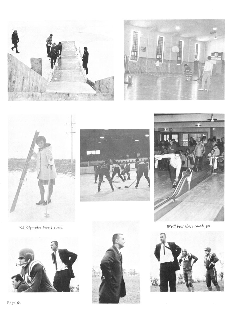 This yearbook page gives a sense of the variety of sporting and recreation activity at SDU in the early 1960s. Note the hint at male-female rivalry in the bowling photo caption. Also of note is the (rather frightening) home-made Winter Carnival “bobsled run” at top left. Mnemosyne 1963. p. 64.