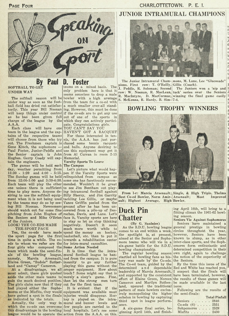 Intramural bowling was a popular feature of the SDU sports and recreation scene in the 1950s and 1960s, and provided an early opportunity for SDU women to compete alongside — and against — their male classmates. Red and White [newspaper]. vol. 2, no. 7 (April 18, 1962). p. 4.