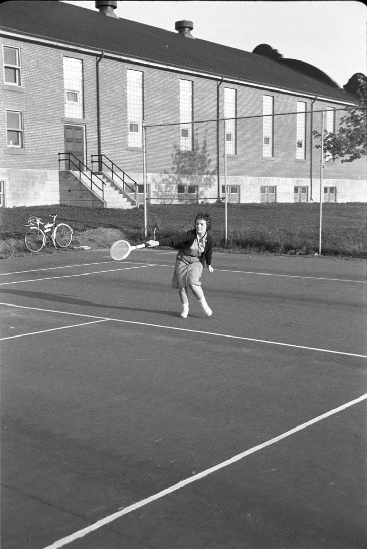 A co-ed plays tennis on a fine evening, ca. 1962. The sport enjoyed a revival amongst both male and female SDU students after the construction of paved tennis courts during the summer of 1960; the courts were on the northwest side of the Alumni Gymnasium, where the Murphy Student Centre’s parking lot is now located. G. Harris SDU Photographic Collection (UPEI Archives Acc #: 2013-250), Image 21-7942.