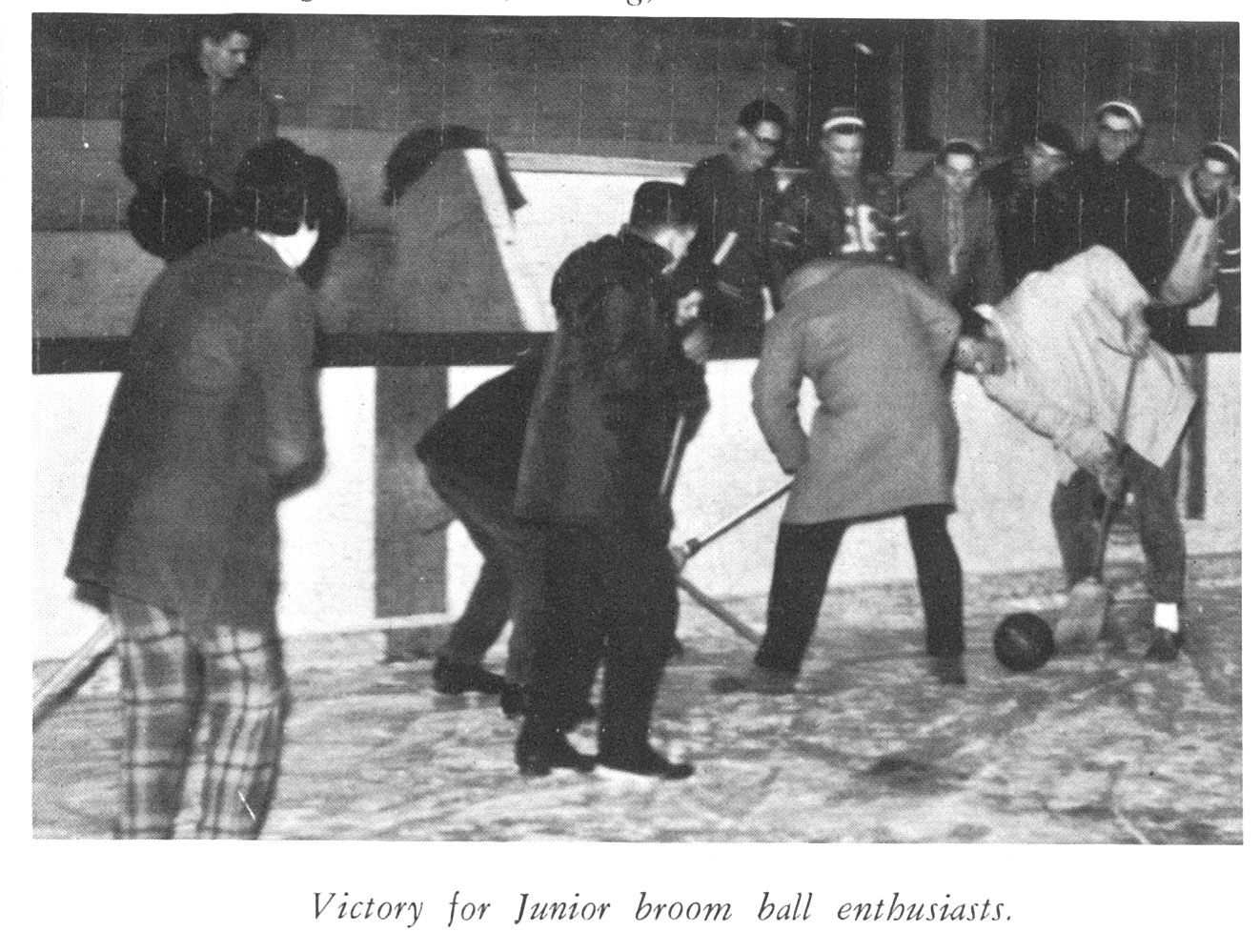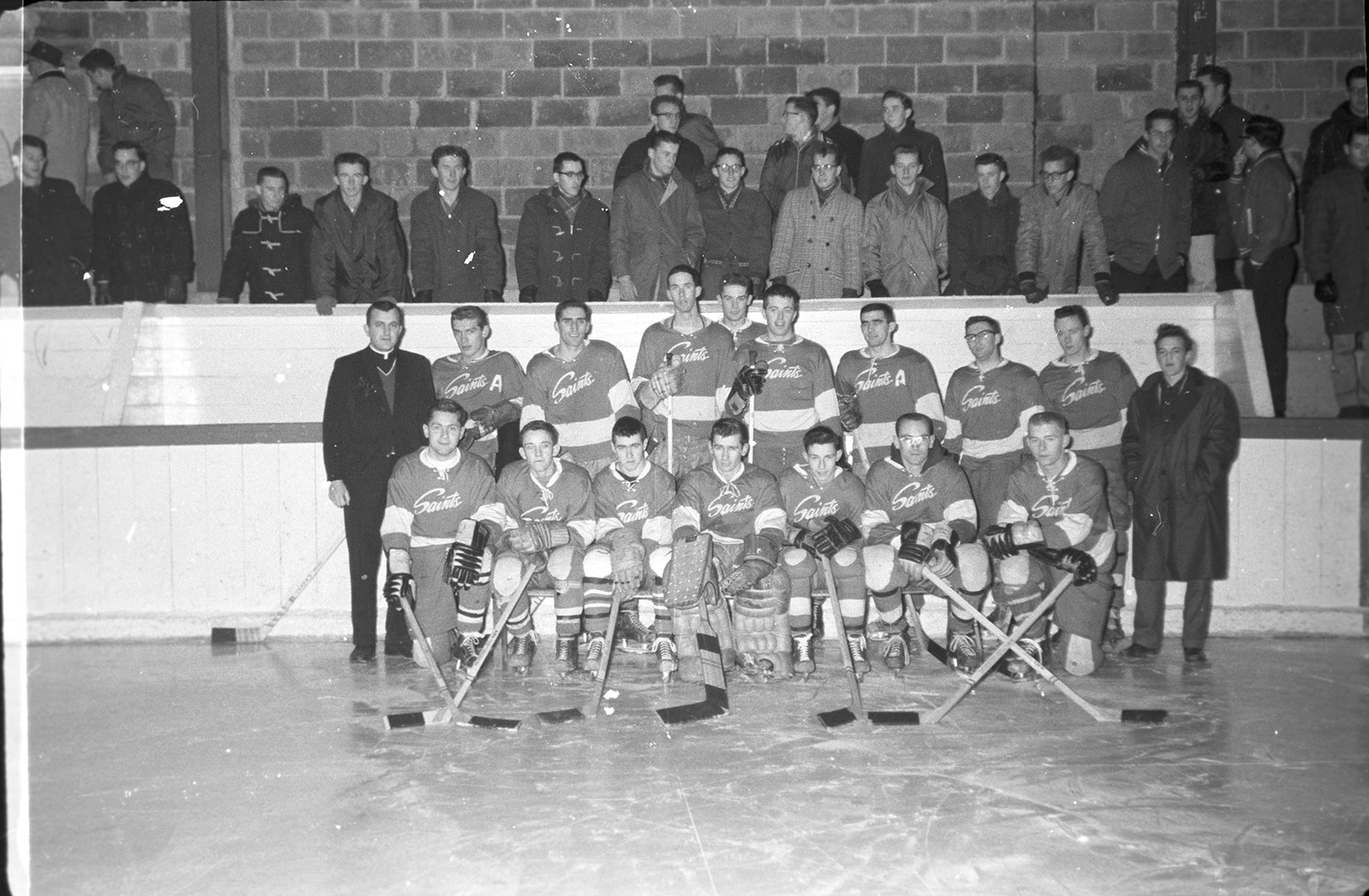 Even with such exciting novelties as hard-court tennis and Canadian football, hockey remained the perennial SDU favourite, which made the new rink especially welcome. The 1961-1962 team poses here with some of their fans and their coach, Father Frank Ledwell: a young teacher at St. Dunstan’s High School when this photo was taken, Ledwell would go on to be a popular English professor at SDU and then at UPEI; by the time of his death in 2008, he had become one of the Island’s best-loved writers and storytellers. G. Harris SDU Photographic Collection (UPEI Archives Acc #: 2013-250), Image 20-7907.