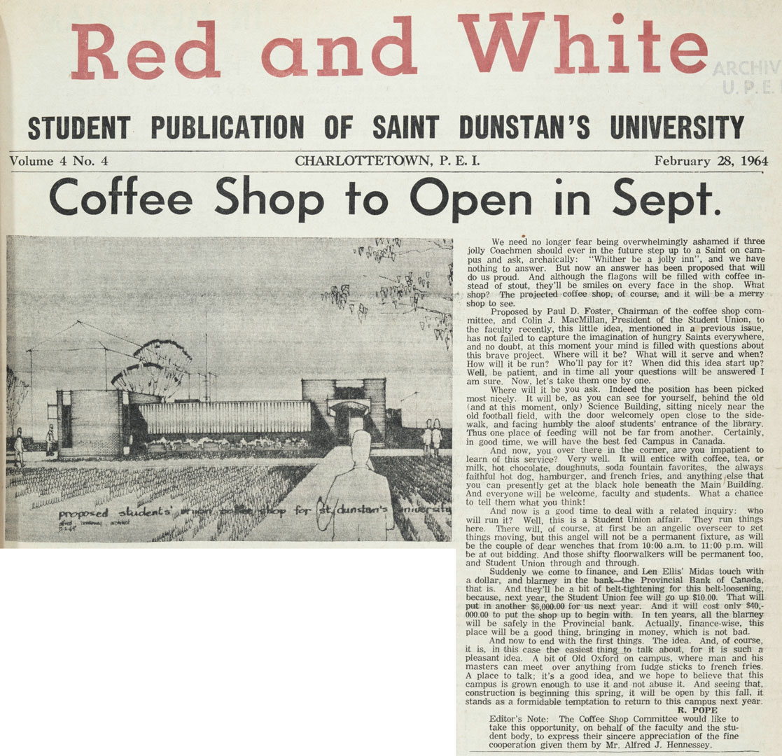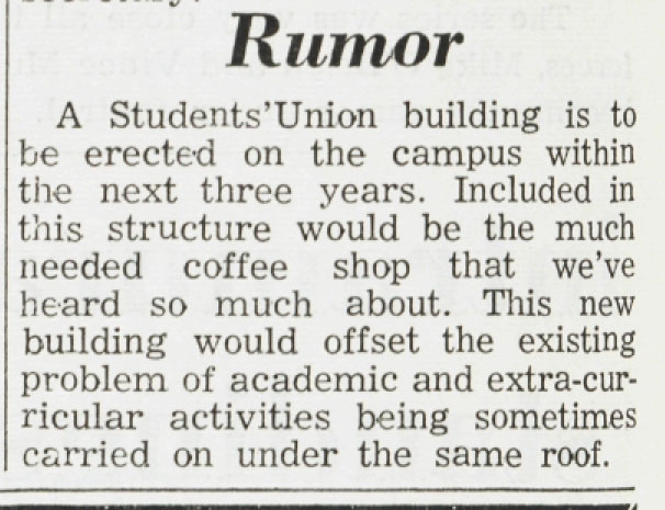 As this Red and White article suggests, rumours of a Student Union coffee shop had been circulating on campus for some time before the idea finally began to come to fruition during the 1963-1964 academic year. Red and White [newspaper]. vol. 3, no. 7 (May 7, 1963). p. 6.
