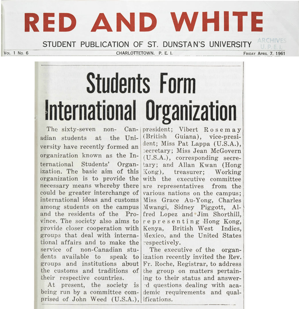 When the International Students Organization formed in the Spring of 1961, it represented 67 non-Canadian students, drawn from 6 different countries. Red and White [newspaper]. vol. 1, no. 6 (April 7, 1961). p. 1.