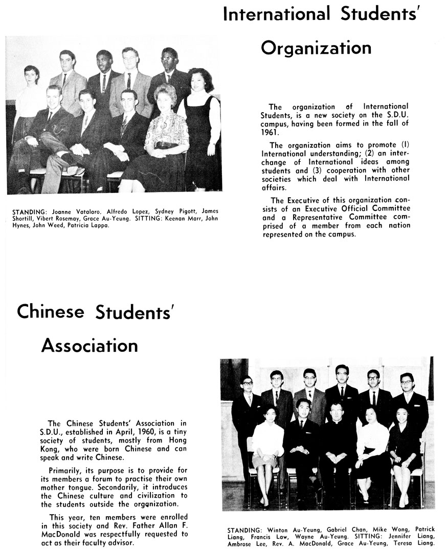 By the 1961-1962 academic year, SDU boasted both an International Students Organization and a Chinese Students Association. Mnemosyne 1962. p. 27. By the 1961-1962 academic year, SDU boasted both an International Students Organization and a Chinese Students Association. Mnemosyne 1962. p. 27.