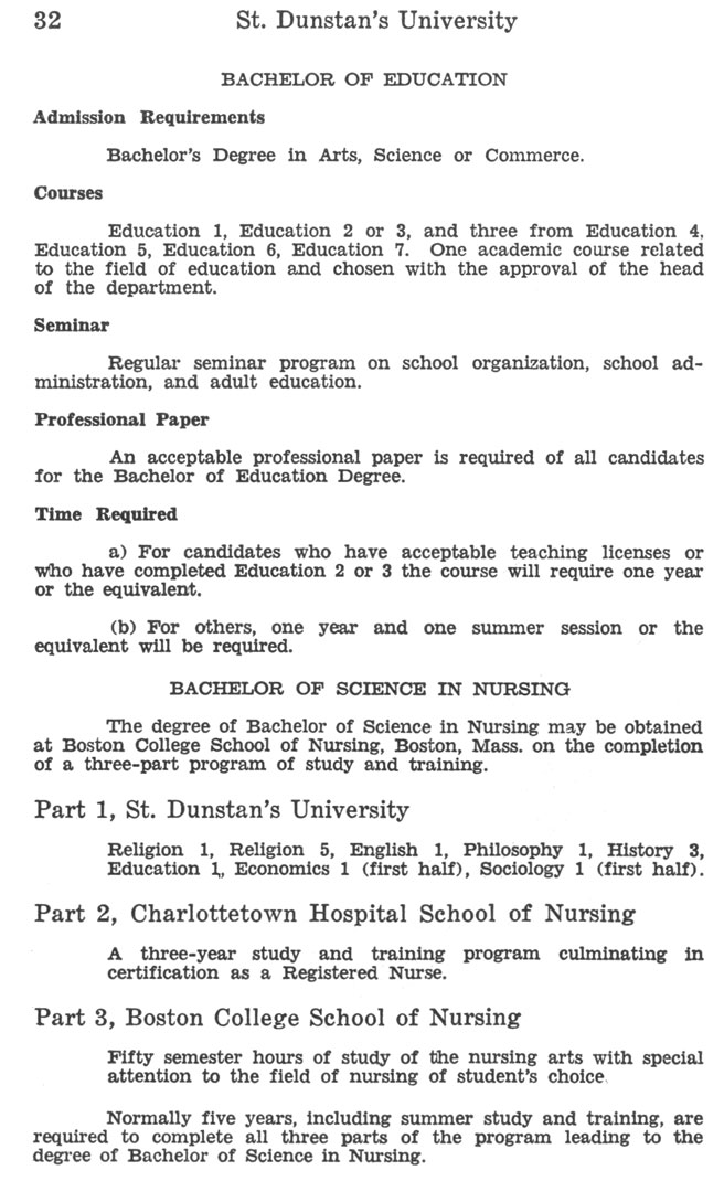 The establishment of a B. Sc. in Nursing at SDU in 1962 — what would today likely be dubbed an “articulated program”, as it was offered in cooperation with nursing schools in Charlottetown and Boston — was a boost to female recruitment, since nursing was a growing profession and one that was then pursued almost exclusively by women. St. Dunstan’s University Calendar, 1962-1963. p. 32.